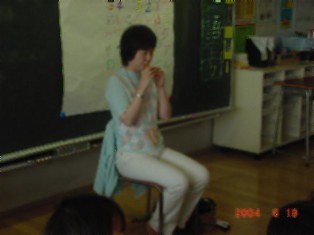 ふれあい集会では、視覚に障害のある杢代さんを招いて楽しい時間を過ごしました。杢代さんには、「うたぼうし」の読み聞かせとコカリナの演奏をしていただきました。 |