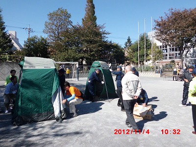 11月4日(日)秋晴れの下、杉四小震災救援所訓練を区役所の所員、町会の皆さん、PTA、児童、教員が集合し、いざという場面を想定し、訓練を実施しました。