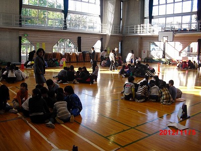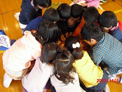 今日の集会は、牛乳ビンのふたに書かれた秋の言葉を探すゲーム。