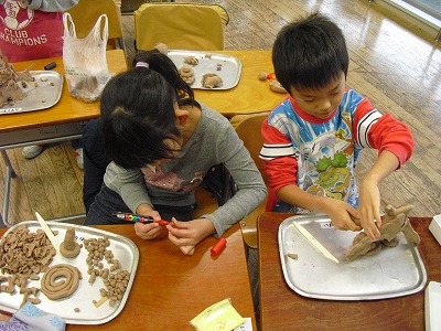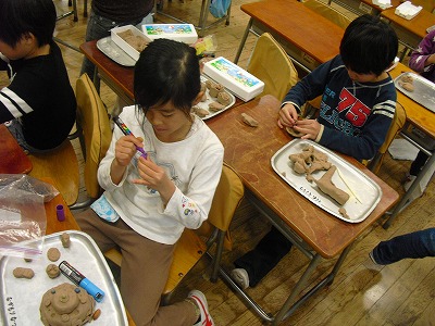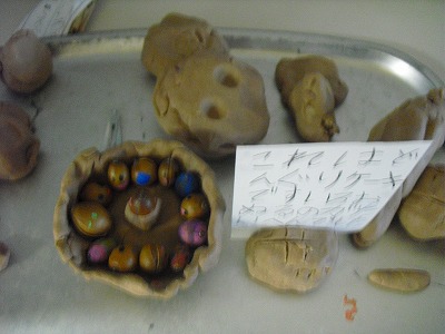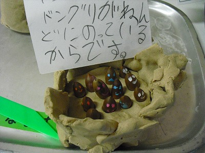 また、どんぐりに色をぬって、粘土で作品を作りました。