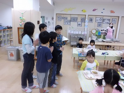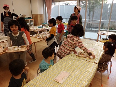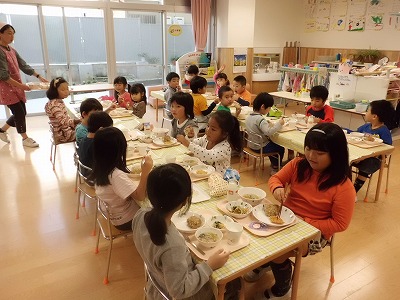 年少さんは、2年生がたくさん食べる姿を見て、モリモリ食べていました。