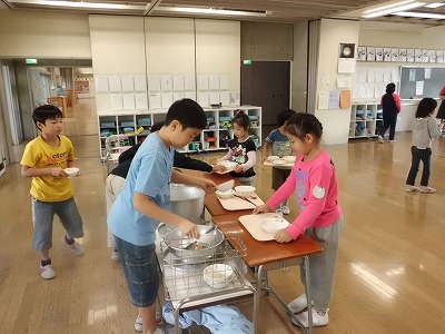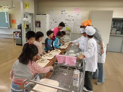 年長さんは、いつもと違う場所、小学校の教室で給食を食べることができて、うれしそうにしていました。