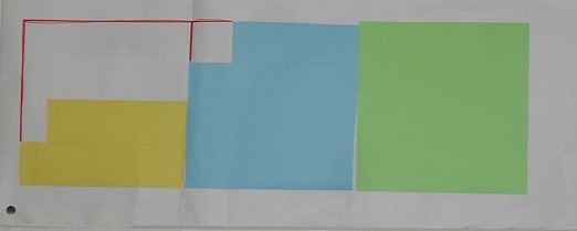 これまで何回か同じようなやり方で授業を行ってきましたが、今回の授業で写真のような比べ方を考えた子がいました。一番右の緑の正方形をかき、青い長方形を切って正方形の中にはって広さを比べています。黄色の長方形も同様な比べ方をしました。どれが広いのか一目瞭然です。とても感心しました。