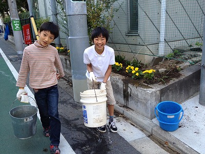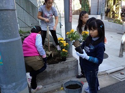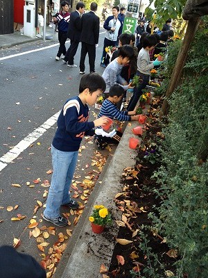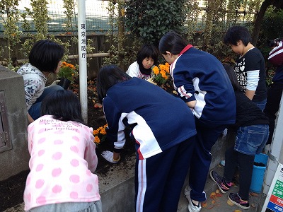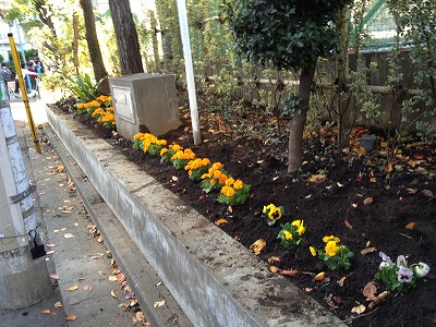 杉四小の周りに、高円寺中学の中学生と一緒に花を植えました♪