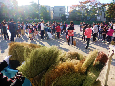 今日の児童集会は縦割り班に分かれて落ち葉広い集会を行いました。