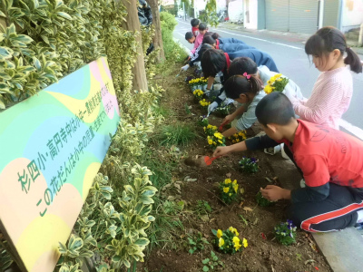 杉四小 校庭南側の花壇にパンジーをはじめ色とりどりの花を植えました。