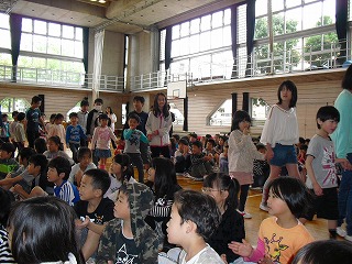 1年生と一緒に交流ゲーム「じゃんけん列車」を楽しみ、
