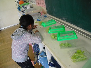 子どもたちは、これから素敵なモンシロチョウになるのを楽しみにして、観察しています。