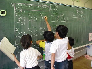 1年生、2年生で学習したことを生かし、くり上がりがある4けた+4けたの計算やくり下がりのある4けた-4けたの計算をしています。