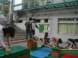 中庭を見ると、子供園の園児達が楽しそうに遊具を工夫して遊んでいます。