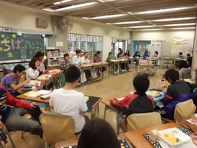 給食の時間も講師の先生とたくさん話をしました。また、講師の先生を囲んで給食を食べたいですね。