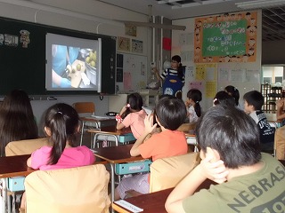 当日の給食を作っている様子をビデオカメラで撮影し、それを子どもたちに見てもらいました。