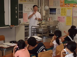 次に、調理員の印南さんに登場していただき、給食で使っている道具の実物を紹介していただきました。