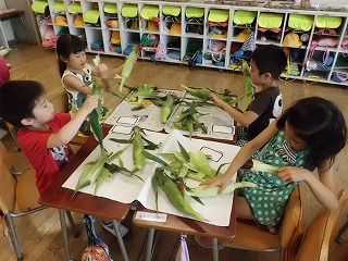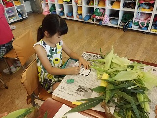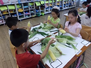 7月8日(月)1校時に、1年生がとうもろこしの皮むきをしました。