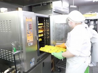 焼きあがったら、各クラスのバットに配食します。