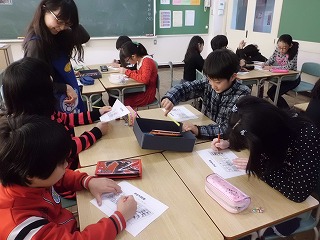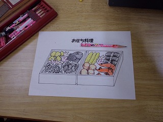 まずは、色のついていないおせち料理の絵に、子供たちが色塗りをしました。