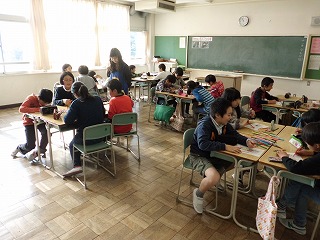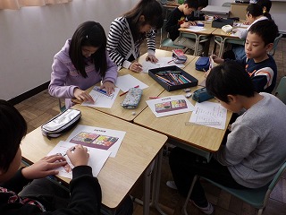 子どもたちが色を塗り終わったら、色のついた同じ絵を配りました。