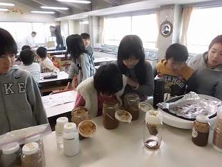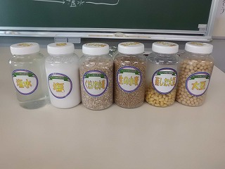大豆、小麦、くだいた小麦、しょうゆ麹などの見本をさわってみました。