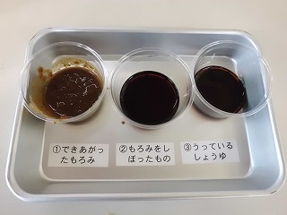 最後に、①もろ味②もろ味をしぼったもの③売っているしょうゆの味見をしました。