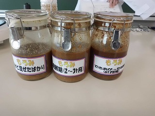 作りたてのもろ味が、2~3か月、6か月と変化する様子を見せていただきました。