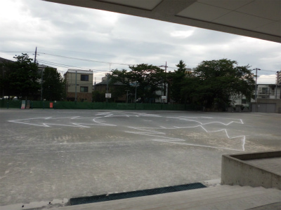 今日の午後、写真撮影の業者の方が校庭に絵(模様?)をひたすら描いていました。