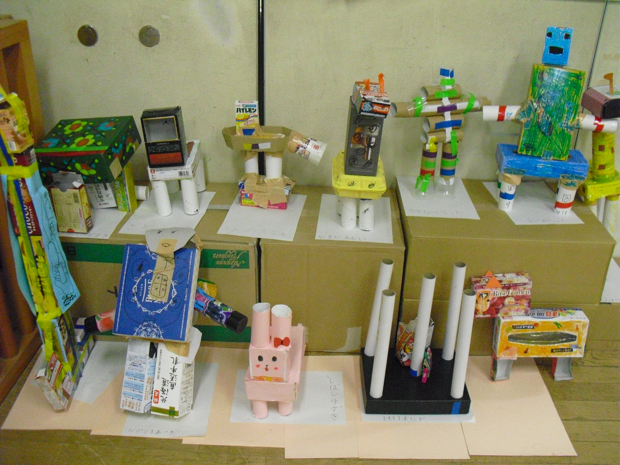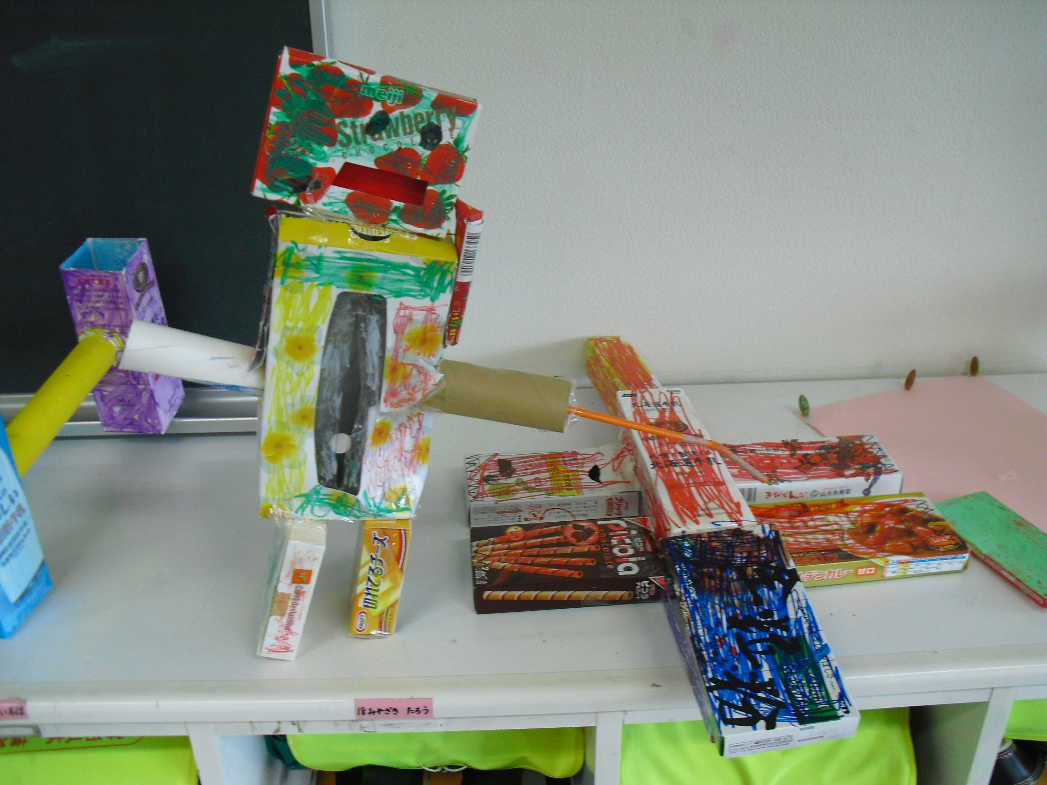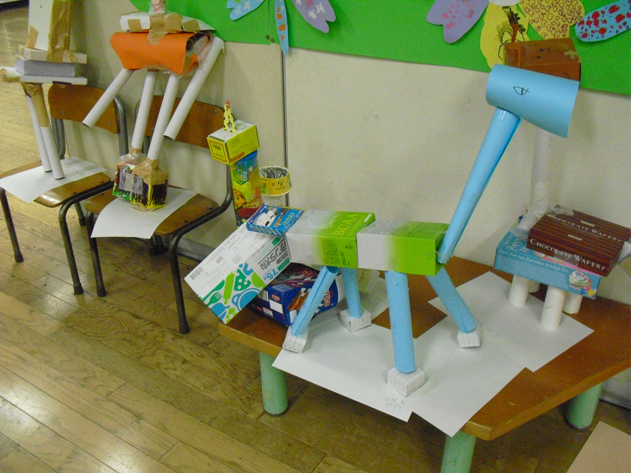 図工の時間に、算数の時間で利用したいろいろな箱を使って、動物やロボット等を作りました。大きい箱、小さい箱、丸い箱、長い箱、切ったり貼ったりしながら子ども達は楽しく活動していました。