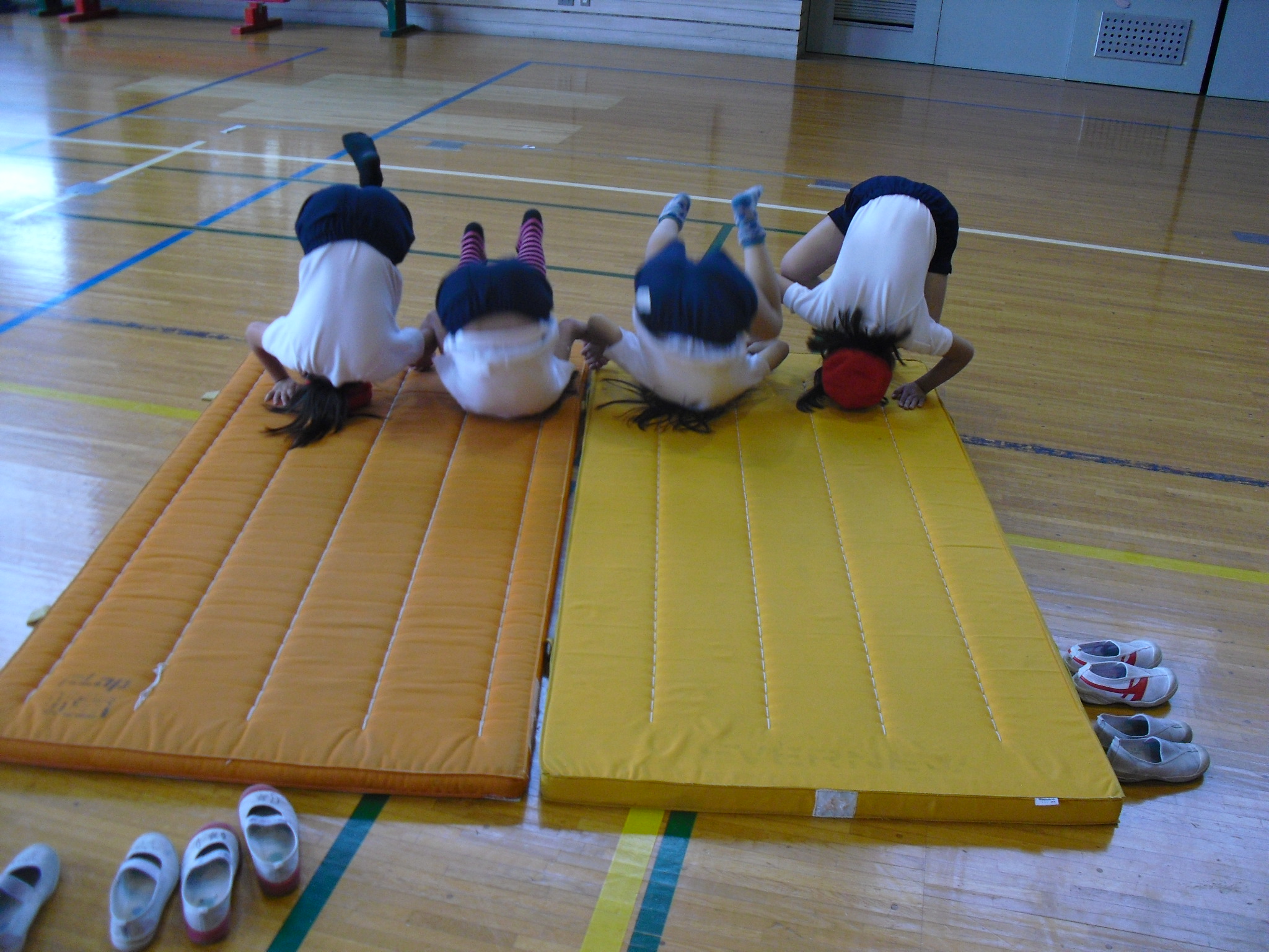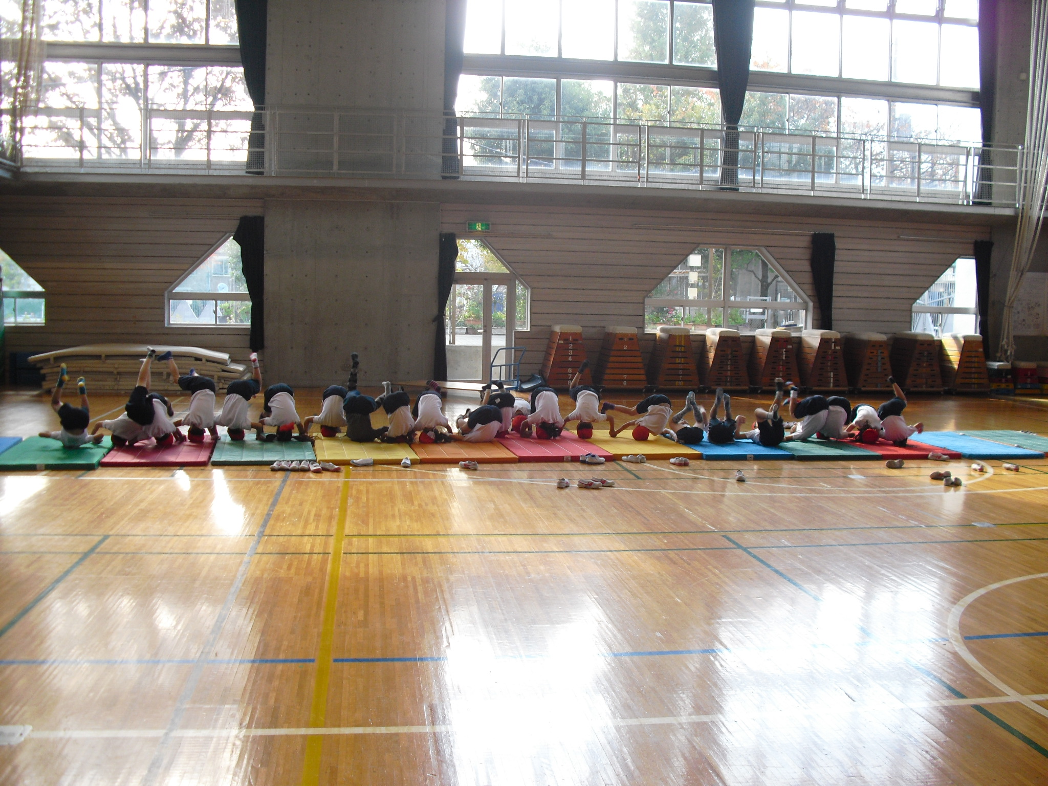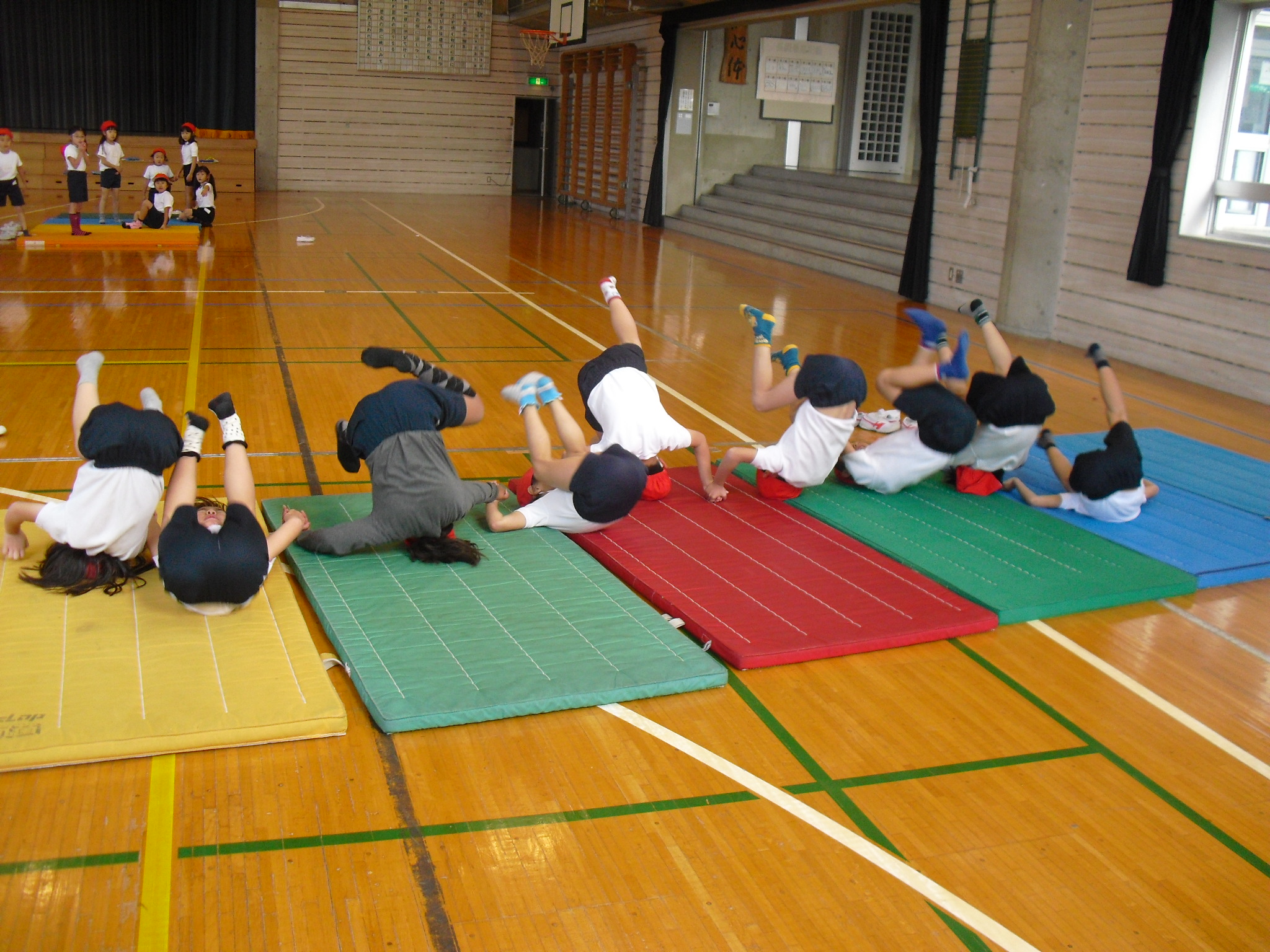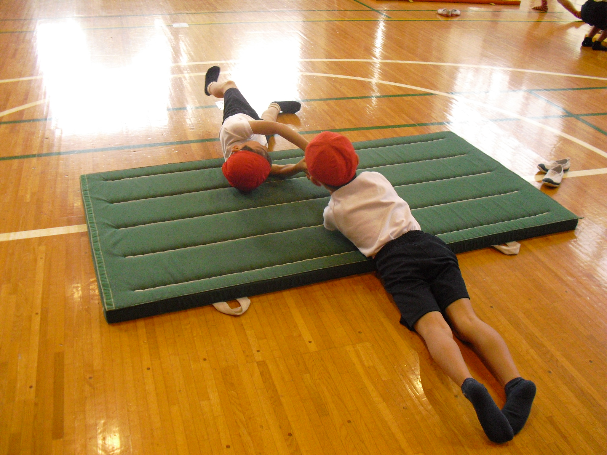 今日は体育館体育で、マット遊びをしました。横にころころ転がったり前回りをしたり、マット遊びは子どもたちに大人気です。マット遊びは1人だけではなく、2人や4人など数人でできるものもあれば、クラス全員でやれる遊びもあります。今回は、友達と手をつないで前回りなどをして楽しみました。