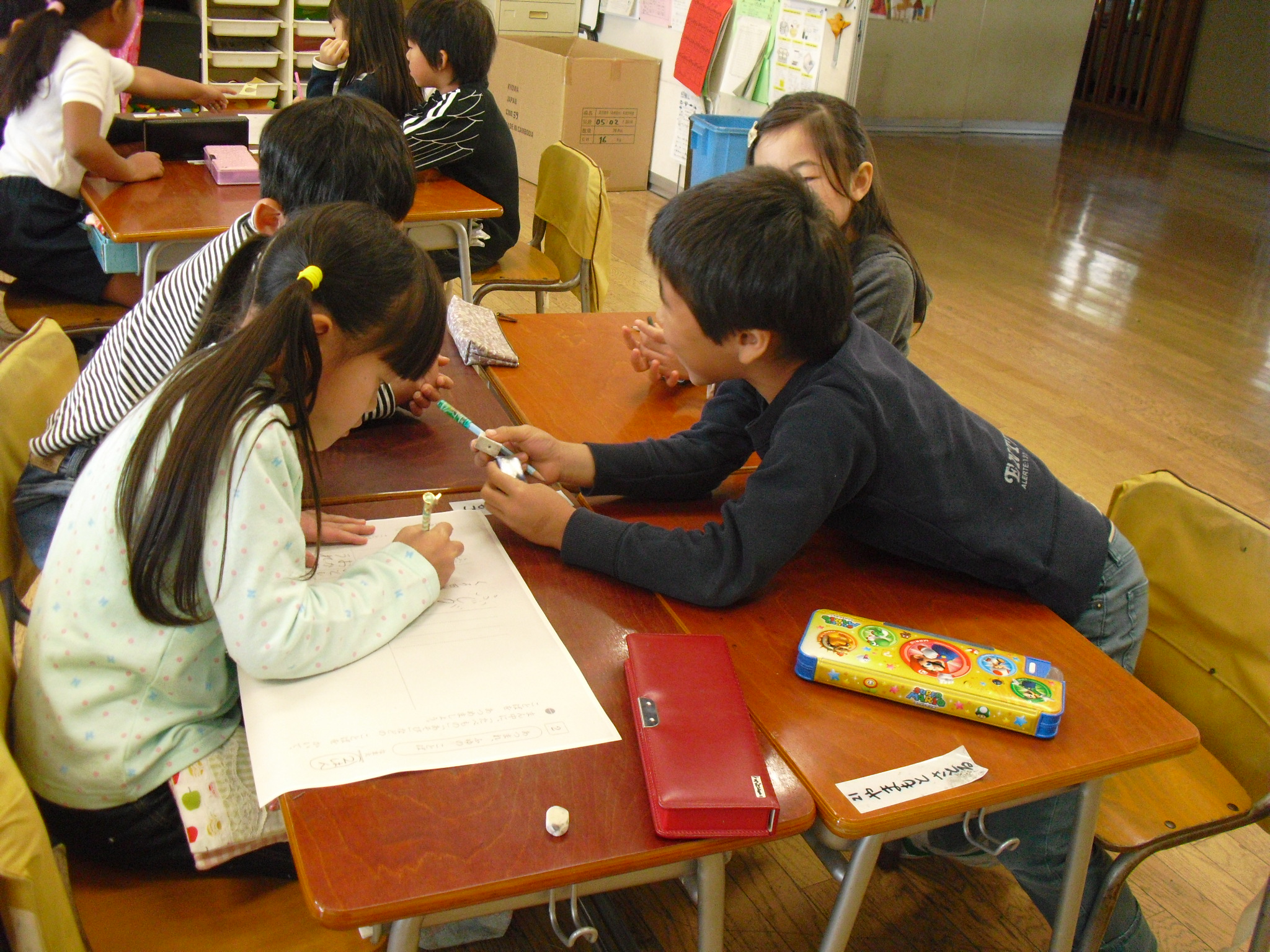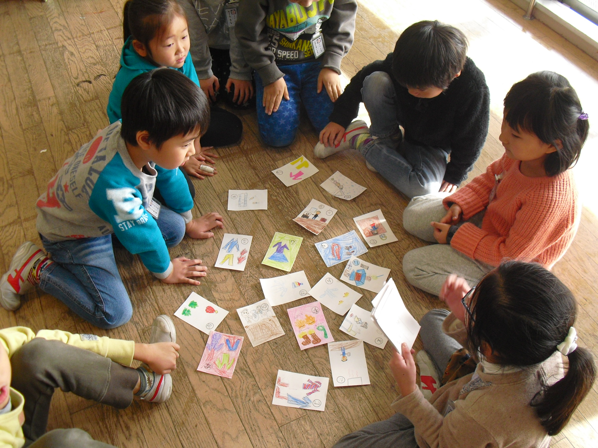 国語の授業で、かるたを作るために冬の言葉を集めました。集めた言葉を使って、かるたの文や絵を作ります。最後は、作ったかるたを見せ合ったり、かるたで遊んだりして楽しみました。