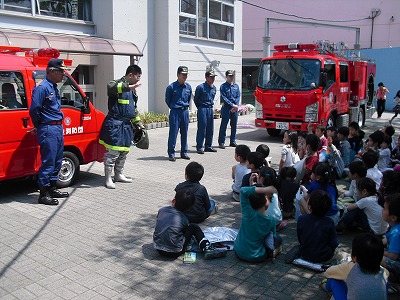 4月25日(金)は消防の写生会がありました。身近で初めて見る消防車に、子どもたちは興奮いていました。防火服に着替える姿も見せていただき、着替える速さに子どもたちは驚いていました。少し暑かったですが、子どもたちは最後までしっかりと絵を描くことができました。