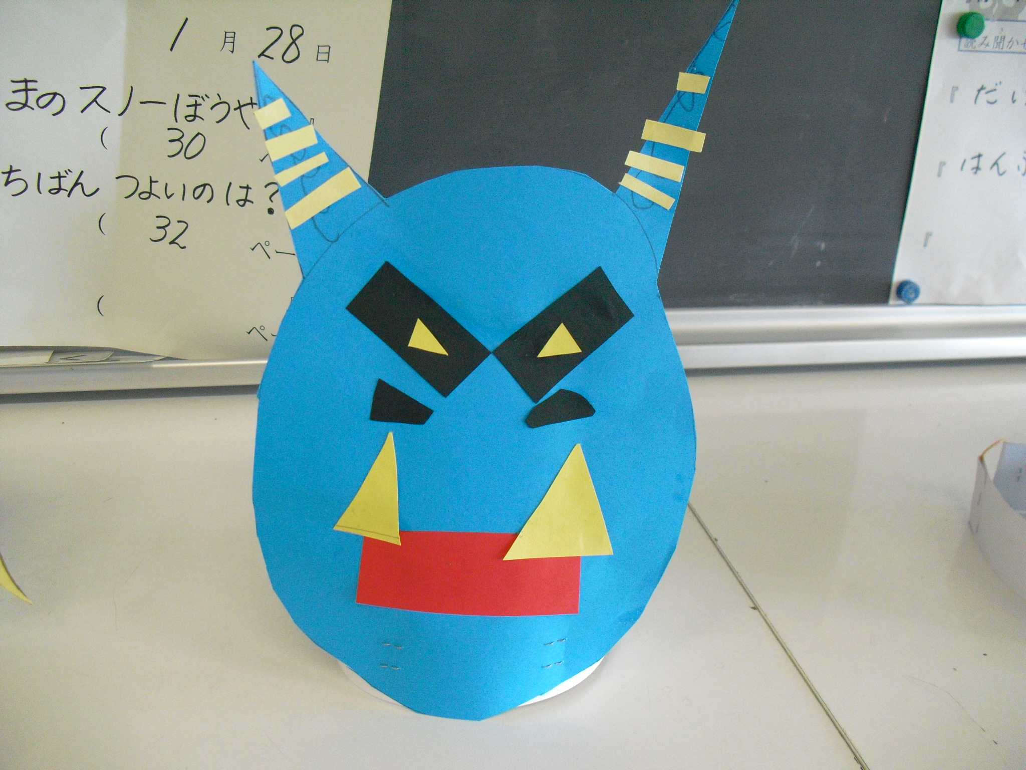2月3日(火)の図工の時間に、鬼のお面を作りました。表の部分は鬼の顔を作り、裏には「自分が追い出したい鬼」を書きました。縄跳びができない鬼、給食が完食できない鬼、勉強ができない鬼など、子どもたちは自分に合った「追い出したい鬼」を考えていました。