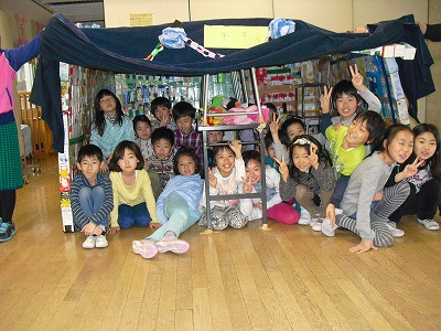 2年生は、牛乳パックを集めて、大きなマンションを作りました。