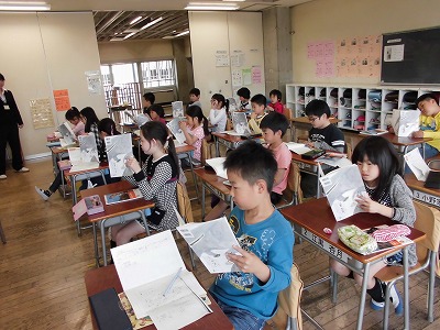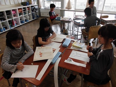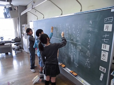 子どもたちは場所や天気、登場人物などを中心に物語の読み取りをしました。