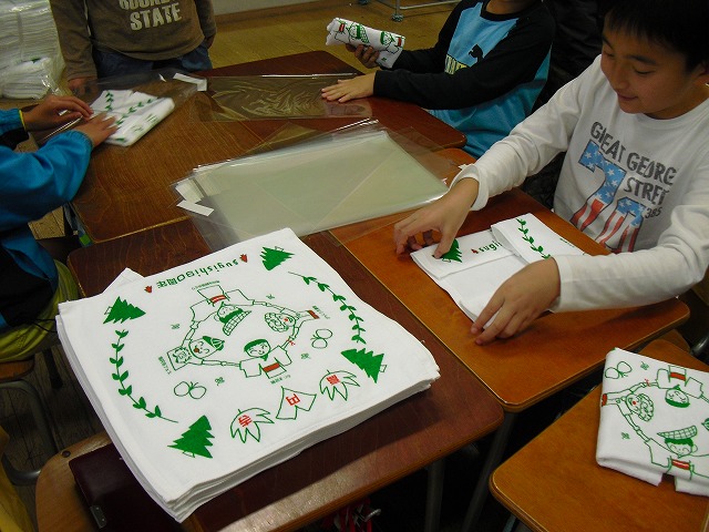 タオルを丁寧に折りたたみ、商品の説明が書いてあるミニ冊子を入れます。