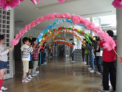 5年生は、花のアーチでをもって、6年生と手をつないできた可愛い1年生を