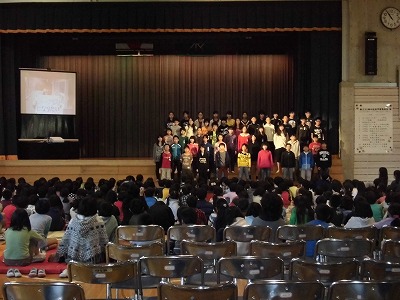6年生は、学習発表会で杉四小で育った自分たちの未来を歌にこめて発表しました。