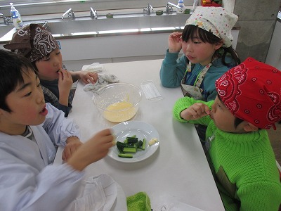 きゅうりに自分たちが作ったマヨネーズをつけて食べるととてもおいしかったようです。