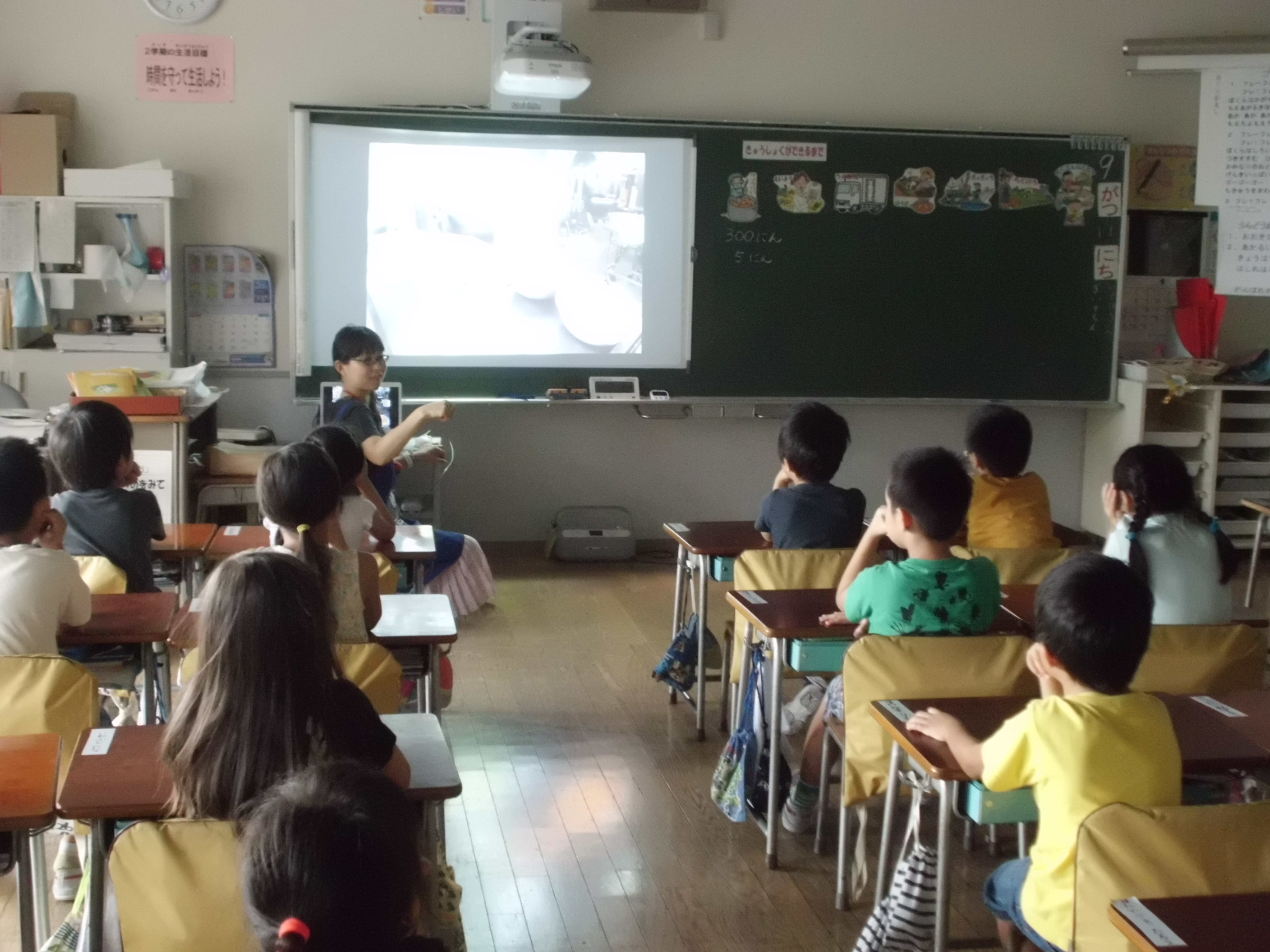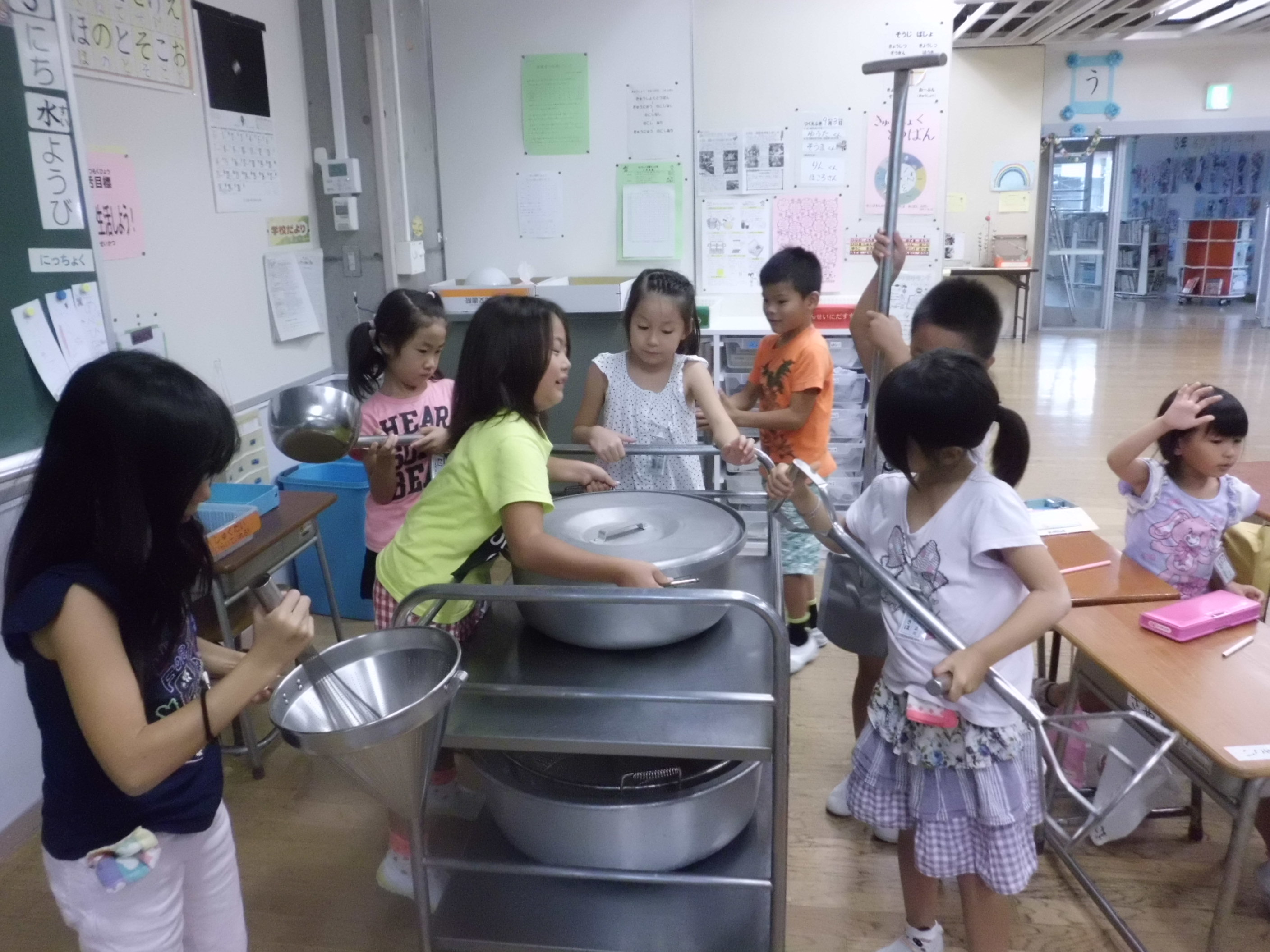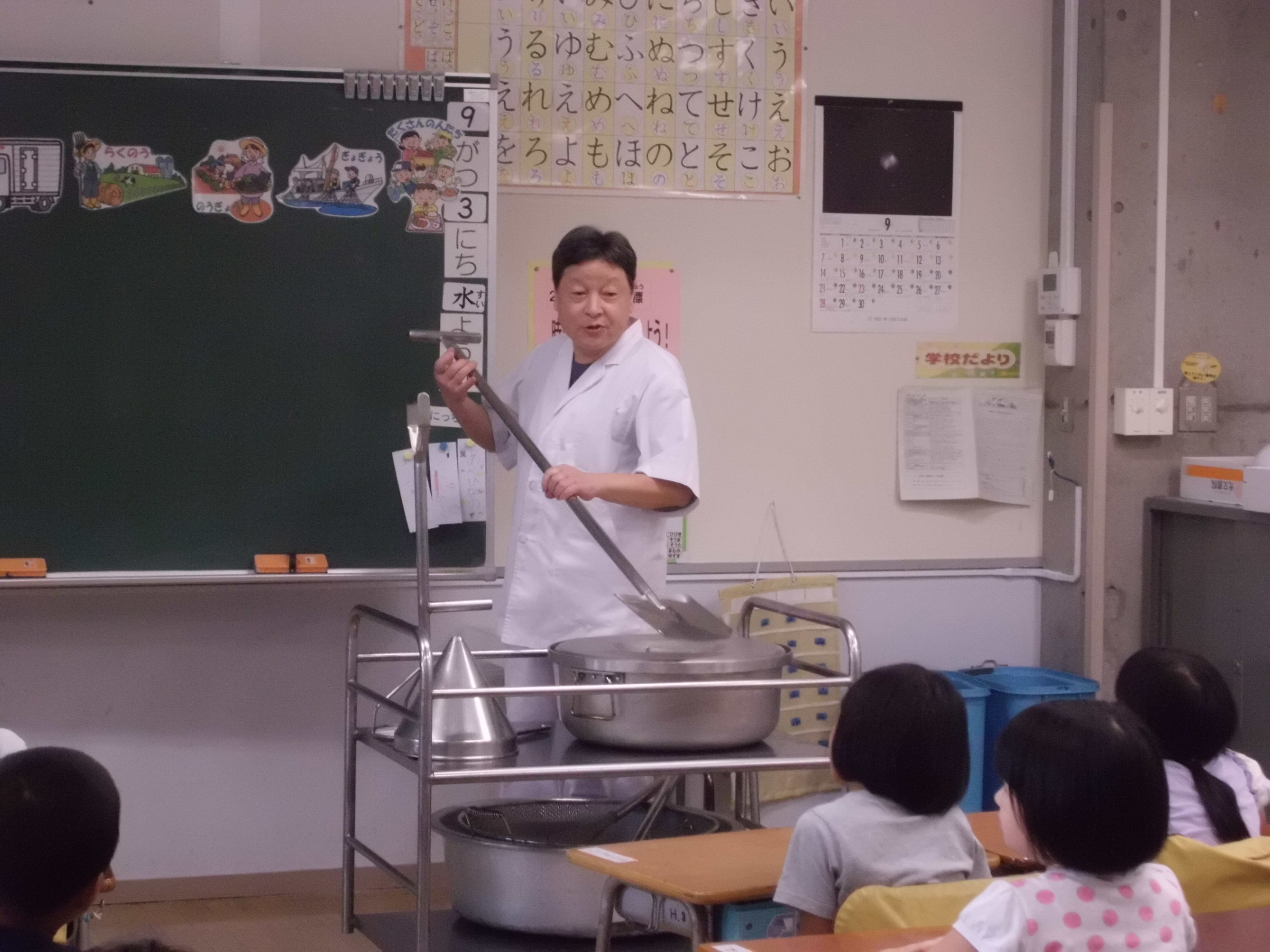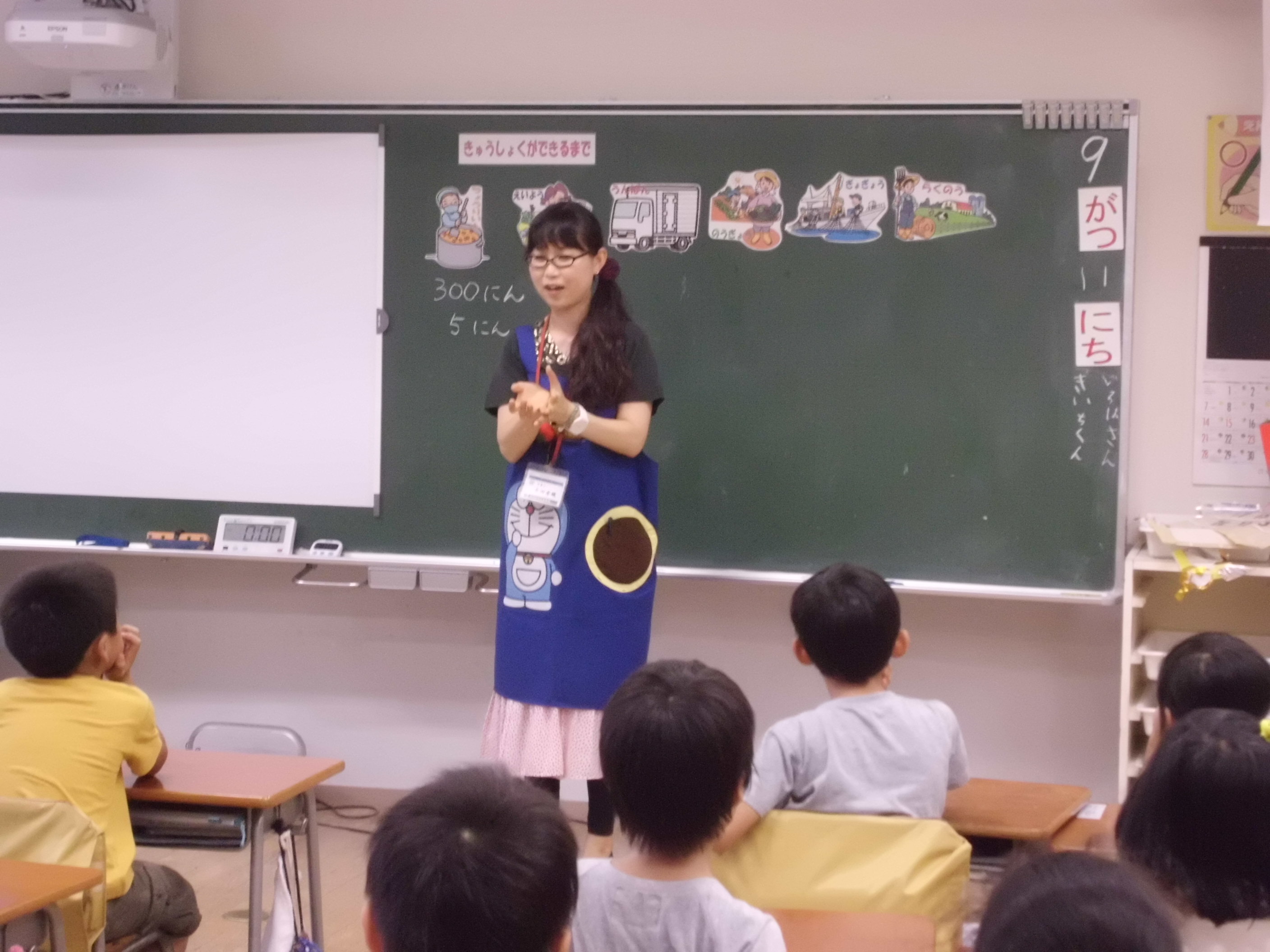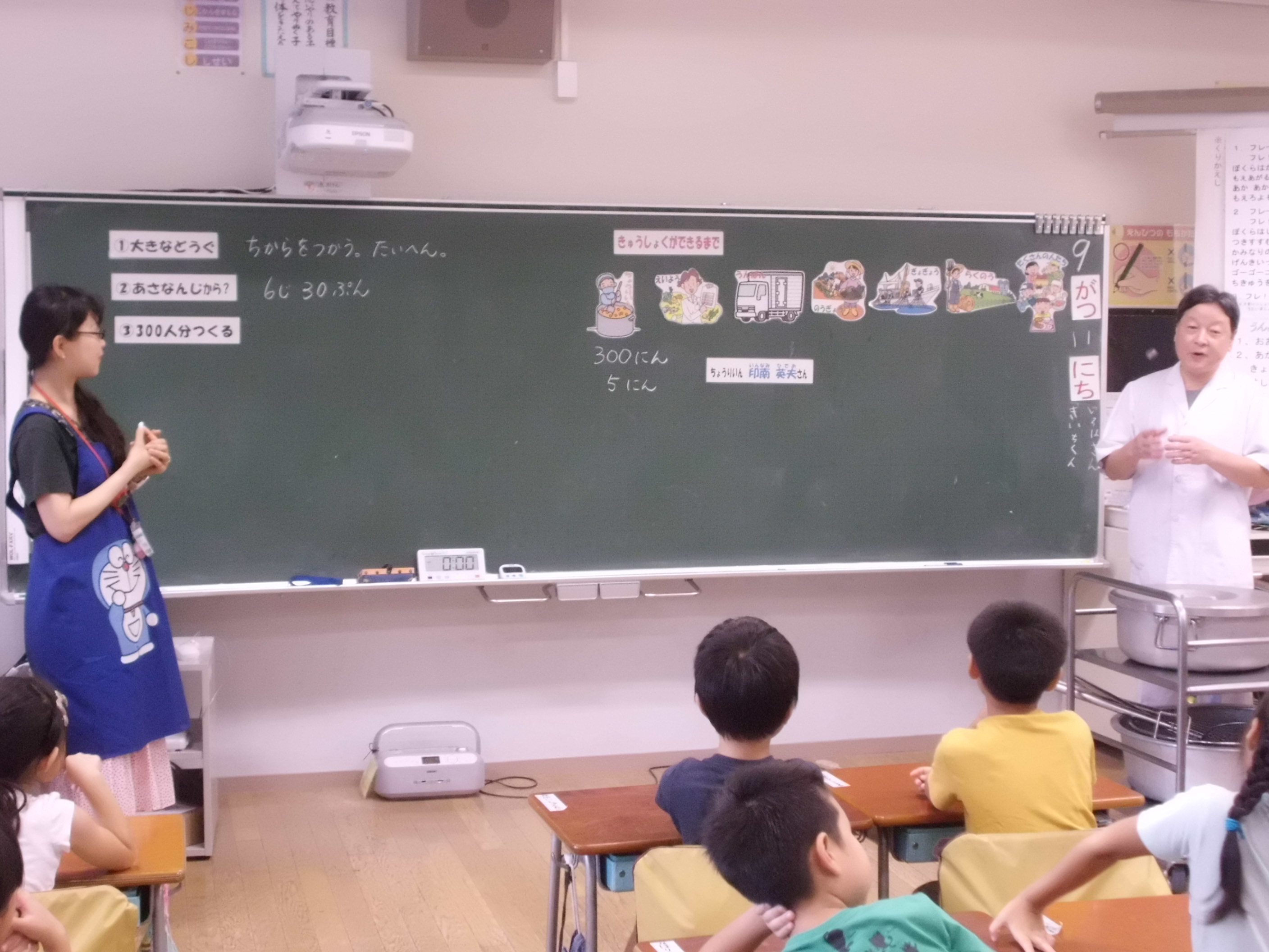 「調理員はもちろん、栄養士、納品業者、農業、漁業、酪農とさまざまな人たちがかかわっているんだよ。」というお話をすると、納得していました。