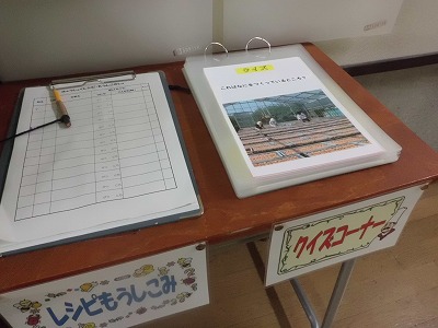 「レシピポケット」の手前の机には、「給食レシピ申し込み書」と「クイズコーナー」を設置しました。