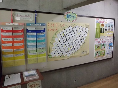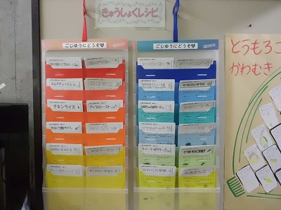 場所は、児童玄関の正面右側にある「食育コーナー」の一角です。