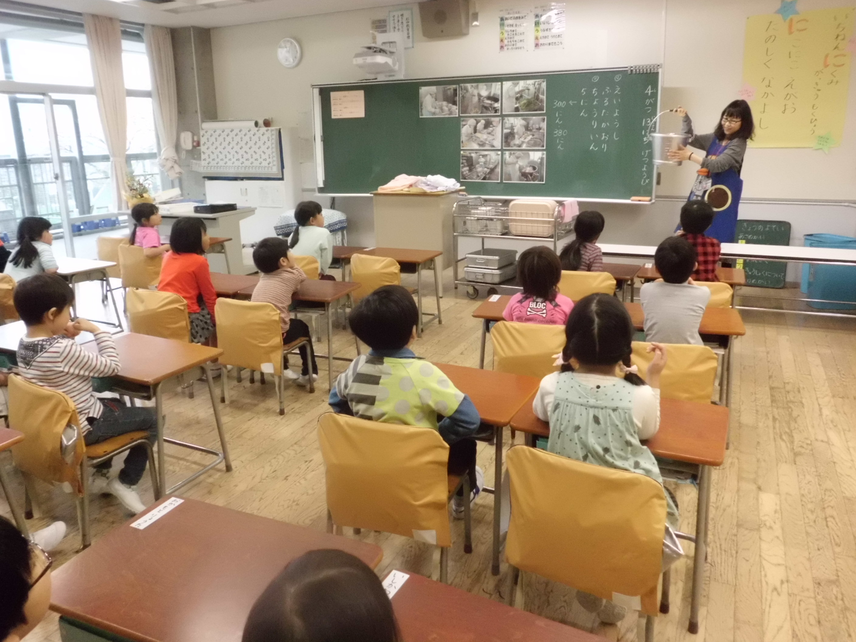 翌日から始まる給食に向けて、給食のきまりなどを学ぶ授業です。