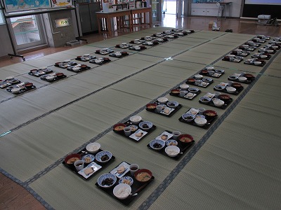 オープンスペースにござを敷いて、和食器に盛り付けた給食をセッティングしました。