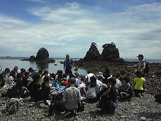 2日目は朝から雨。朝会もレクルームで行いました。午前中、磯の話を地元の方からうかがうことが出来ました。お弁当を食堂で食べたあと、なんと!晴れたので、磯観察をすることが出来ました。体験ができて本当に良かったです。宿舎に戻りフォトフレーム作りをしました。今日はそのあとおみやげを買い、入浴、夕食、レク大会です。