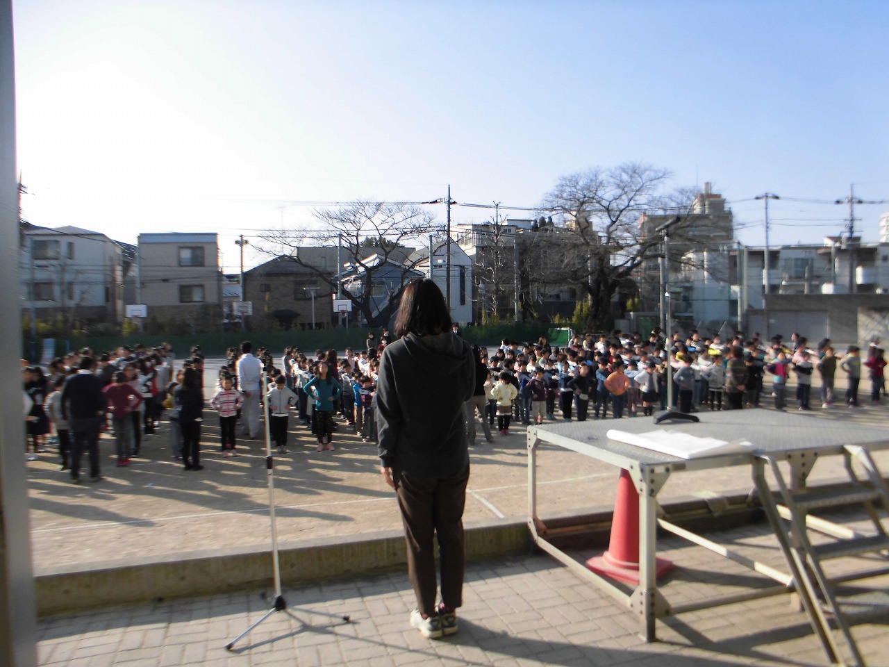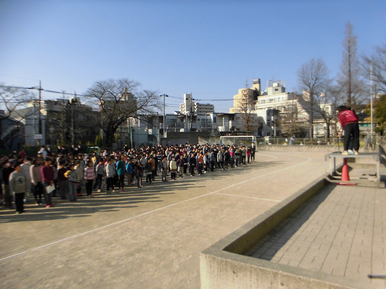 今日の全校朝会は校庭で。