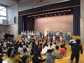 今日の音楽朝会で全校児童の前で演奏を披露しました。