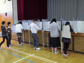 今日の午後、杉八小の体育館で模擬選挙を行いました。