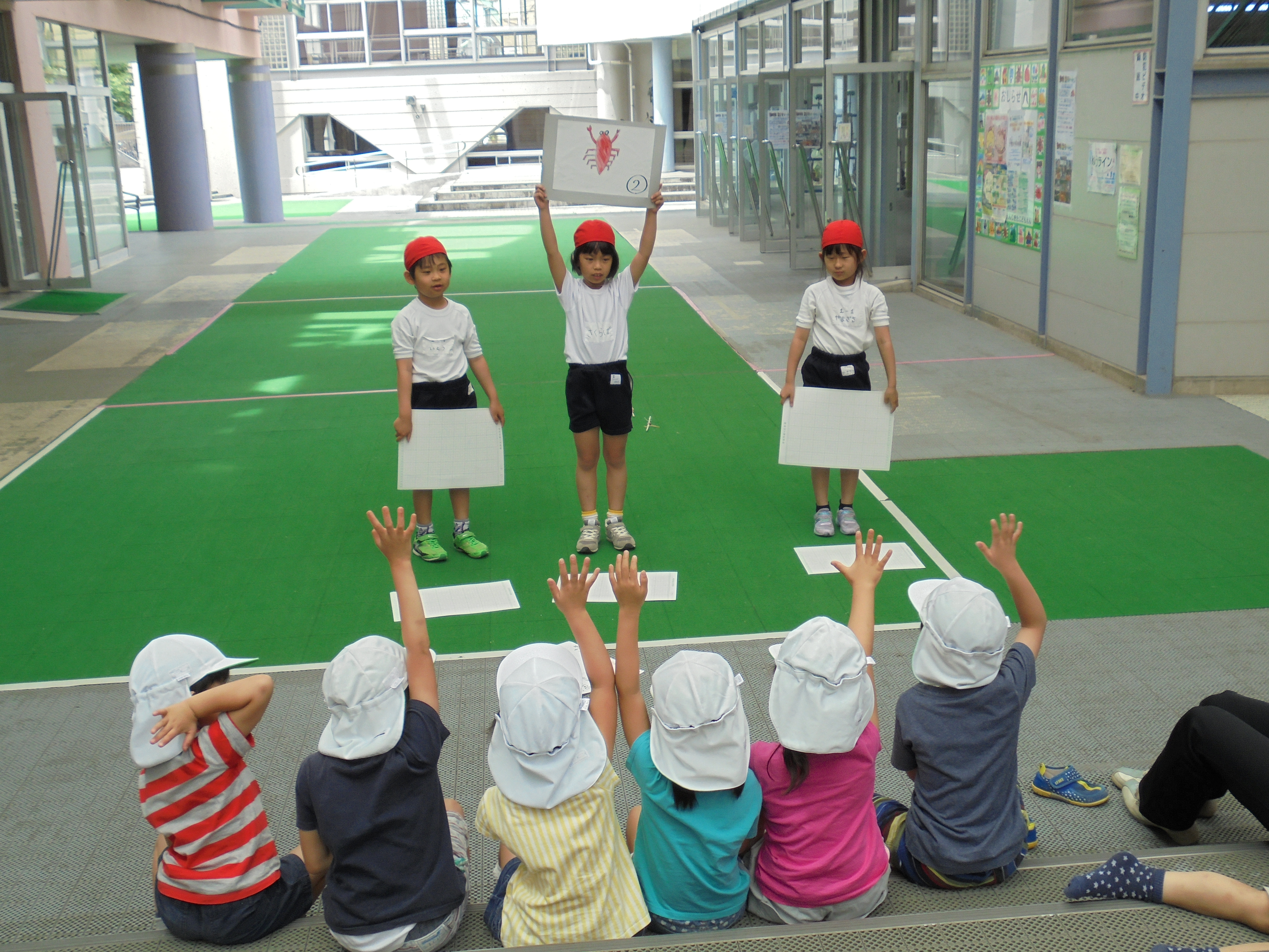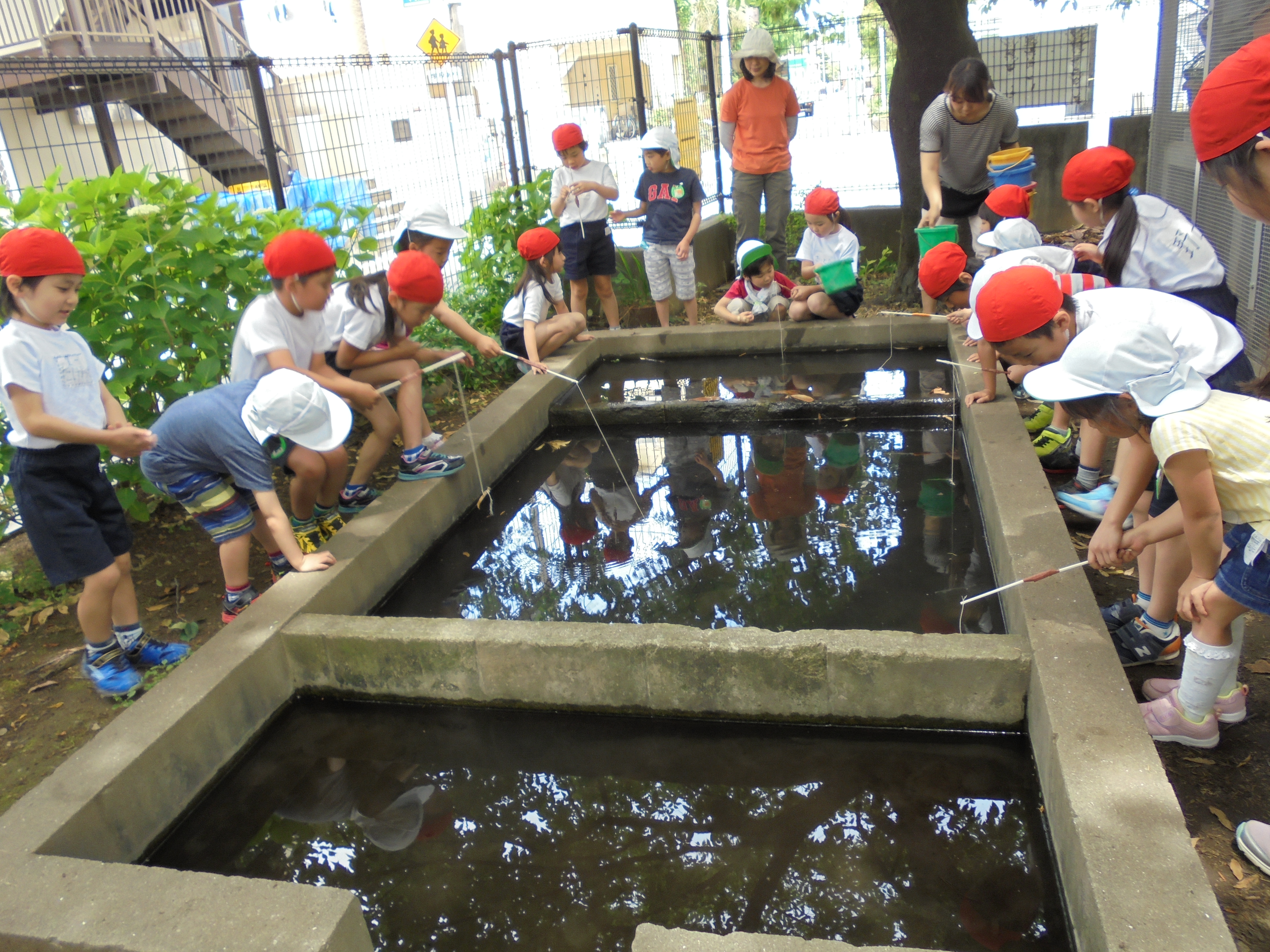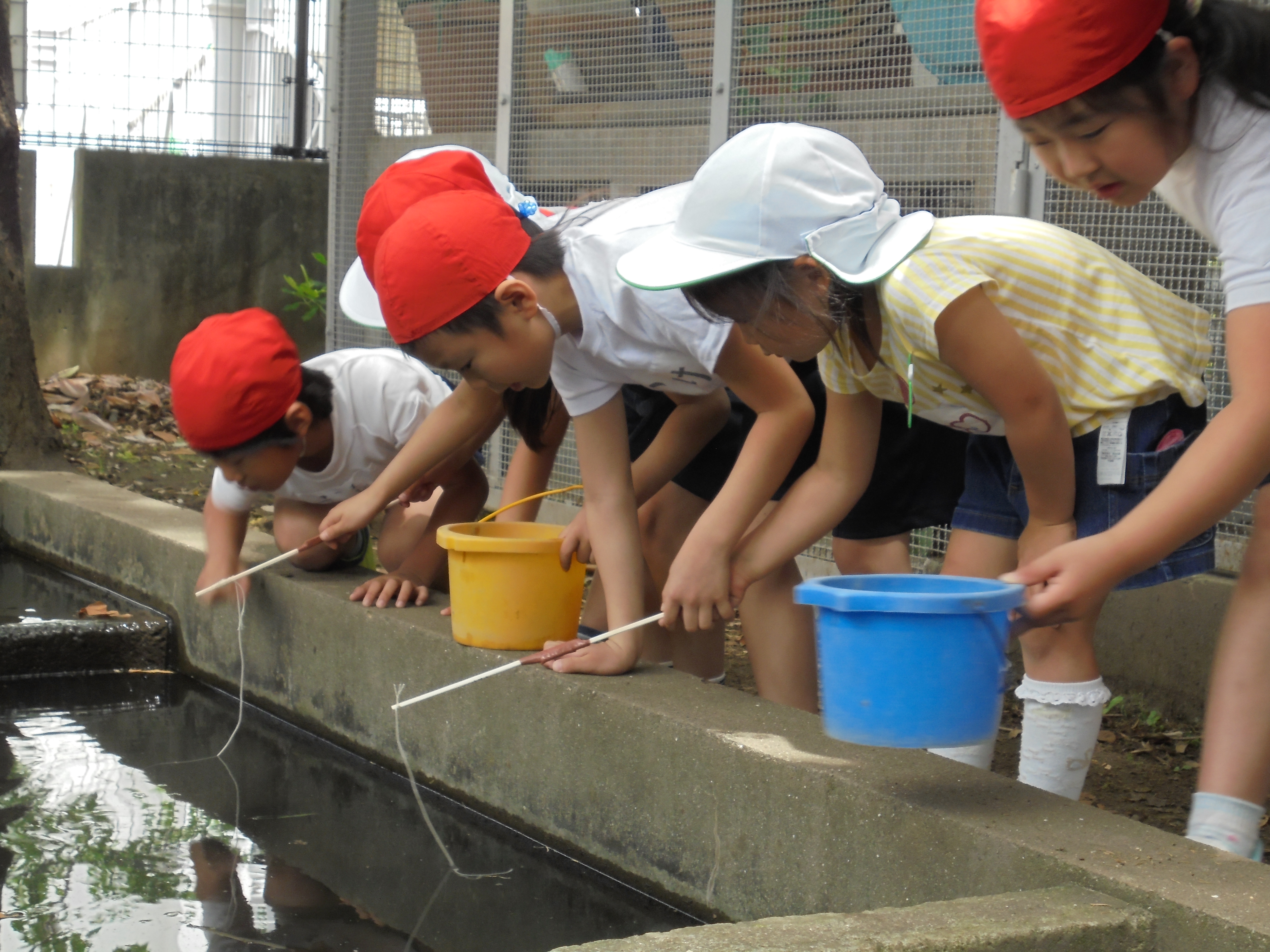 2年1組の子供たちが、子供園さんと一緒にザリガニ釣りをしました。