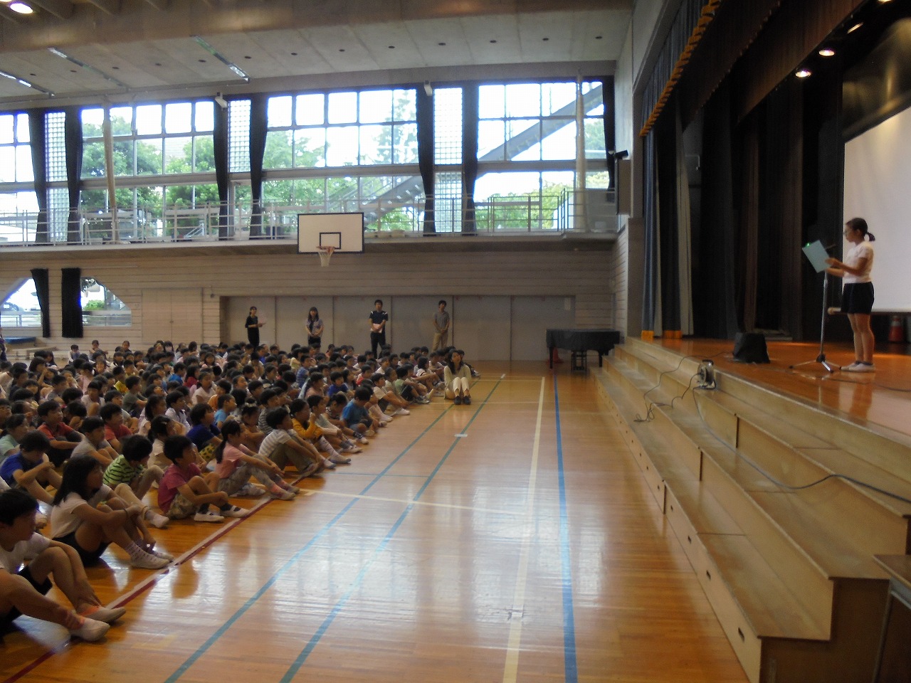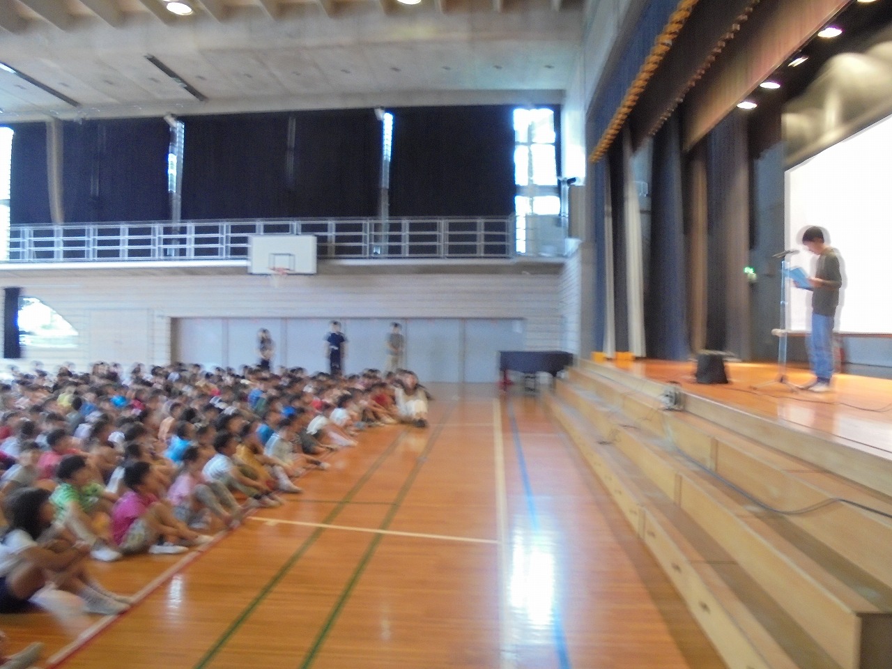 今日の全校朝会は弓ヶ浜移動教室の報告で、