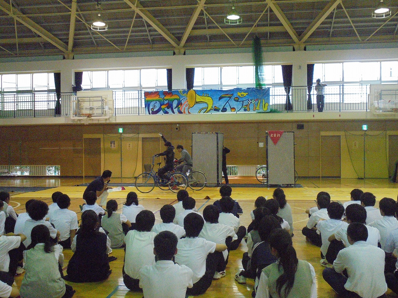 午後、高円寺中でスタントマンによる自転車安全利用講習会が