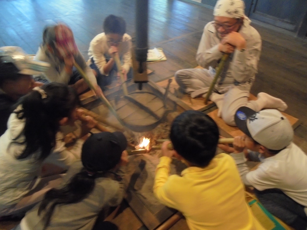 古民家のいろりで、火吹き竹による火おこし体験と