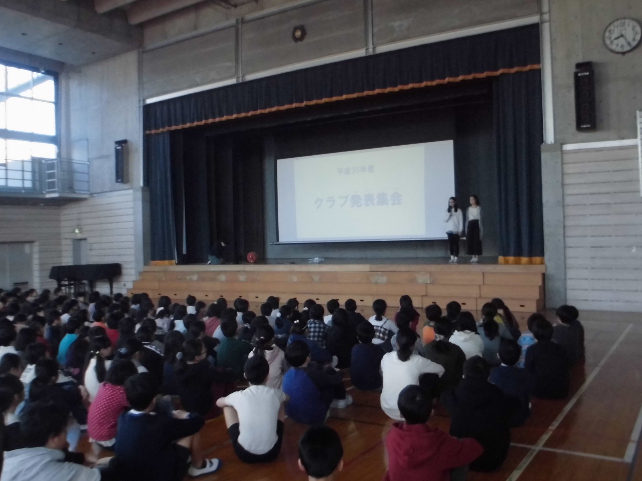 今日は体育館でクラブ発表集会